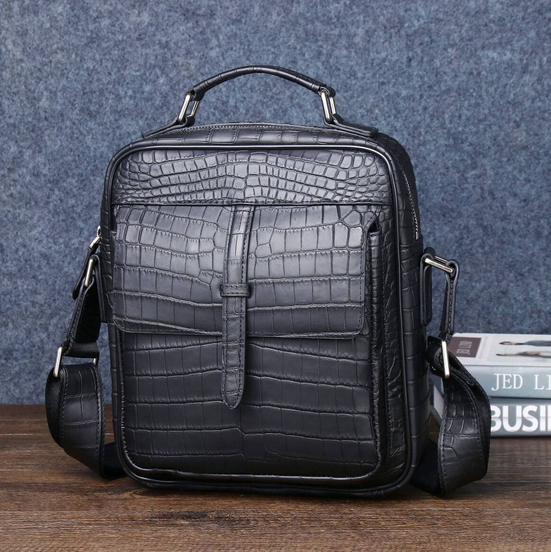 - 人気マット仕上げクロコダイル本革 ワニ革 メンズ ショルダーバッグ 肩掛け メッセンジャーバッグ 斜めがけ 腹部革センター取り 黒