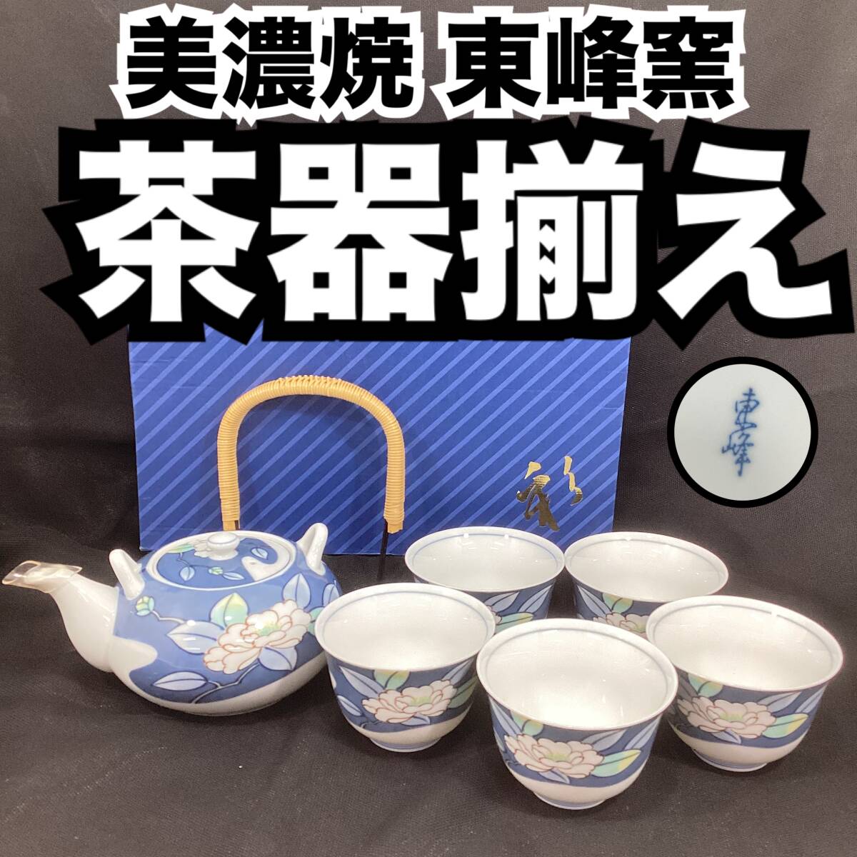 > 【未使用・保管品】東峰窯 茶器揃え 急須 湯呑み 口径約8.5cm 5客 花 白 ホワイト 紺 和食器 陶磁器 磁器 美濃焼 煎茶 (H1860)