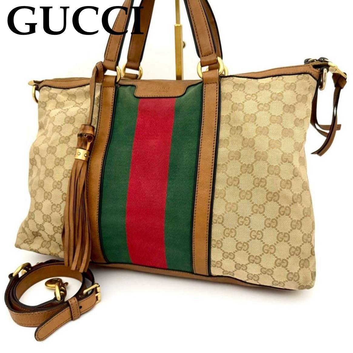 - 美品 GUCCI グッチ トートバッグ 2way ショルダー バンブー シェリーライン GGキャンバス バック 鞄 カバン レディース