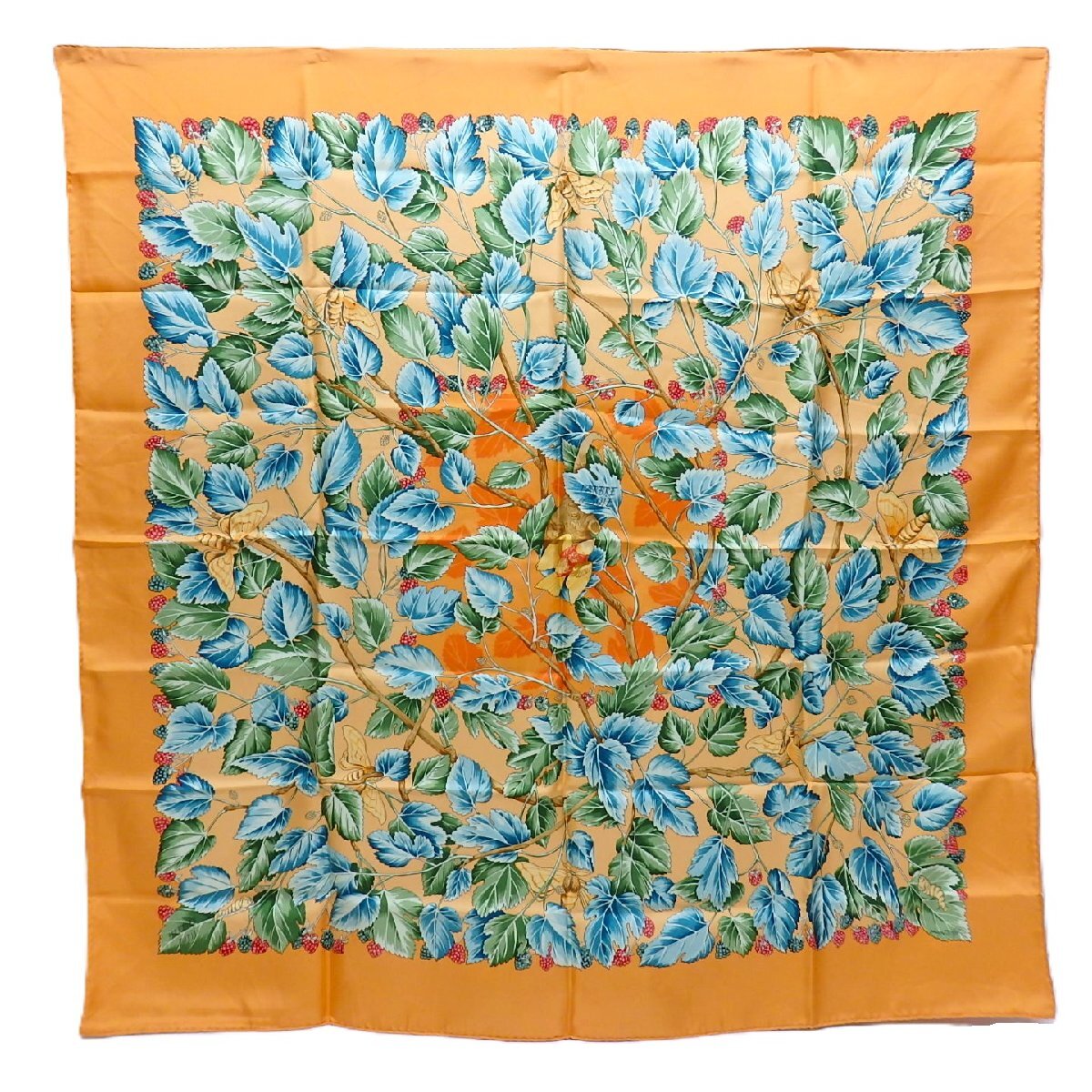 - 極美品 HERMES エルメス カレ90 絹の木 桑の木と蚕 スカーフ オレンジ系[1]SILK100% CARRE90 LARBRE de SOIE ショール ボタニカル柄