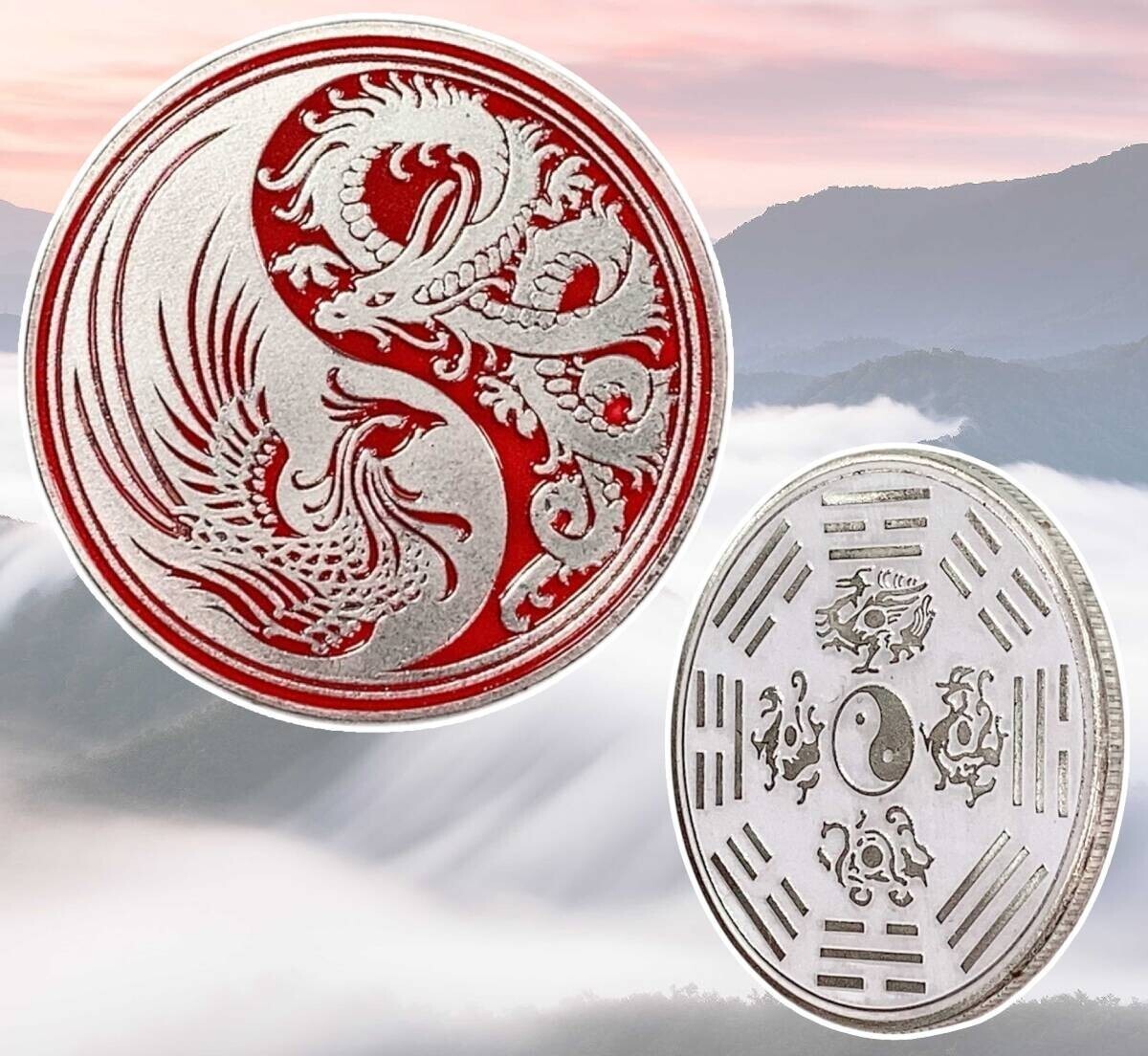 - ★送料無料★「コイン 龍/ドラゴン & 鳳凰/フェニックス 太極図 日本神話/中国神話/風水 赤/銀」tface-g 【タグ:アクセサリー】1