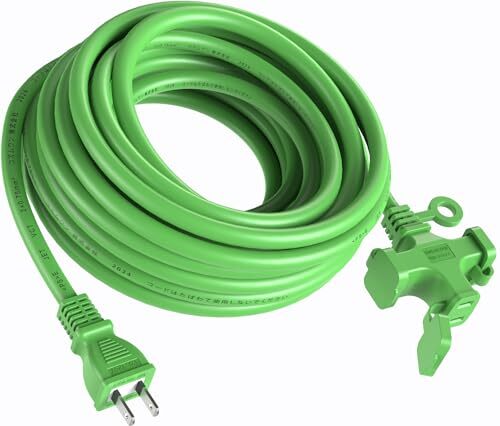 - 延長コード 10m 3個口 VCT高耐久 ソフトケーブル 125V 12A 耐トラッキングカバー付 グリーン 作業用 防塵キャップ