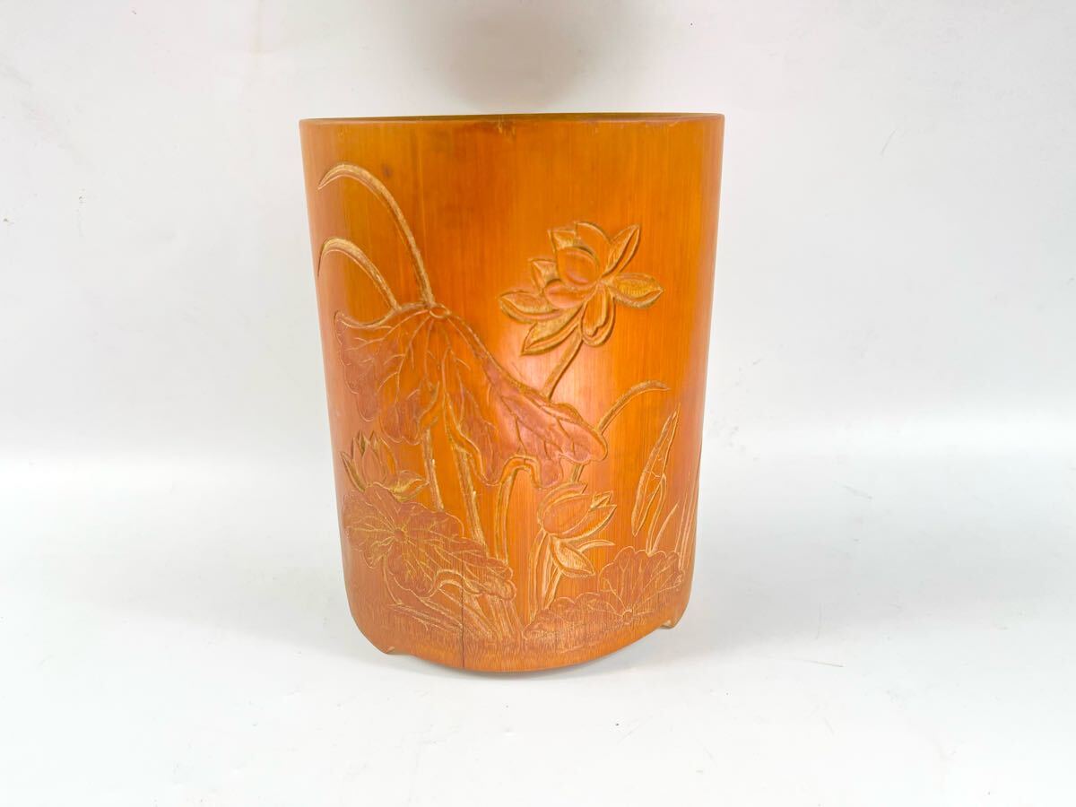 - 竹製 筆筒 彫刻細工 蓮花漢詩文 順治巳亥 文房具 書道具【博圓】高17.6cm