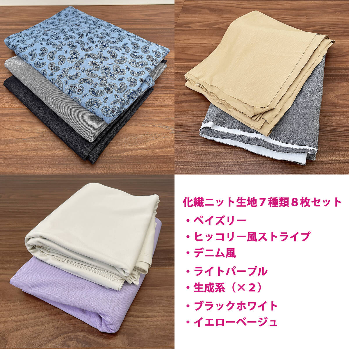 > 未使用 化繊ニット生地 7種類8枚セット 服地 薄手~中厚程度 ペイズリー ヒッコリー風 デニム風 パープル 生成 イエローベージュ 黒白