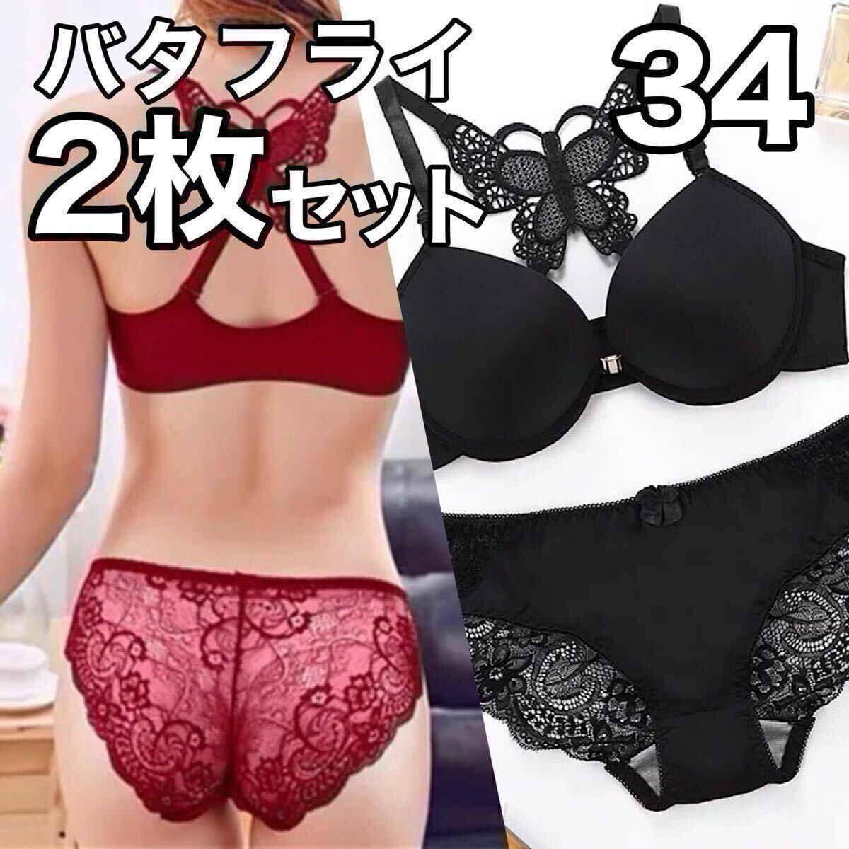 - ブラジャー ショーツ 2枚セット 34 バタフライ ブラック レッド 赤 黒 蝶 フロントホック レディース B75 C65 C70 D65 70c 65c 65d 75b