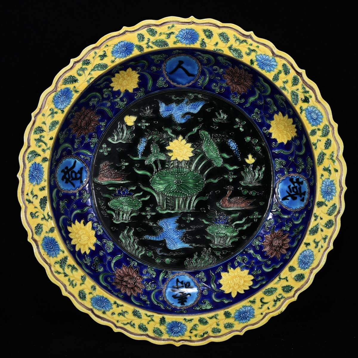 > ◆珍蔵◆中国古美術 大明永樂年製款 粉彩 古陶磁 荷花鴛鴦紋大盤 精品 細密細工造 置物 擺件 骨董品 古賞物 時代物