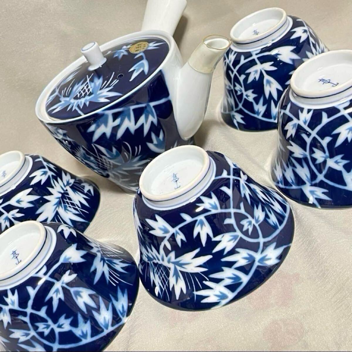 > 有田焼 高山 急須 湯呑み茶碗 茶器揃 5客セット 藍色染付 菊花模様 未使用保管/検 濃紺 青ブルー 昭和レトロ vintage 和モダン食器 陶磁器