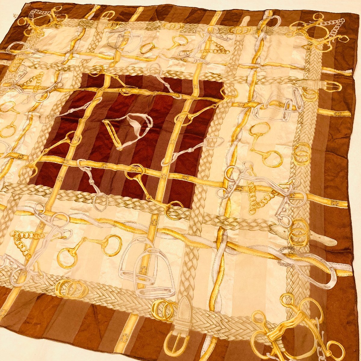 - アルプスカワムラ製 絹 シルク/SILK 100% 大判 スカーフ バッグスカーフ ブラウン/ベージュ系 82 × 86cm
