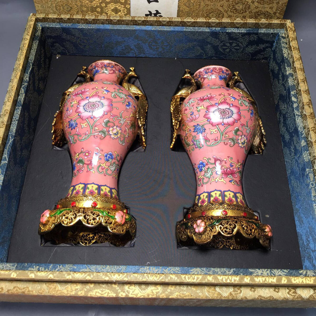 - 9+GV9745「東洋美術」 中国骨董 人間国宝 磁器製品【七宝焼金メッキファミーユローズ花柄花瓶】 旧物 孤品 珍品 陶磁器 収蔵価値が高い