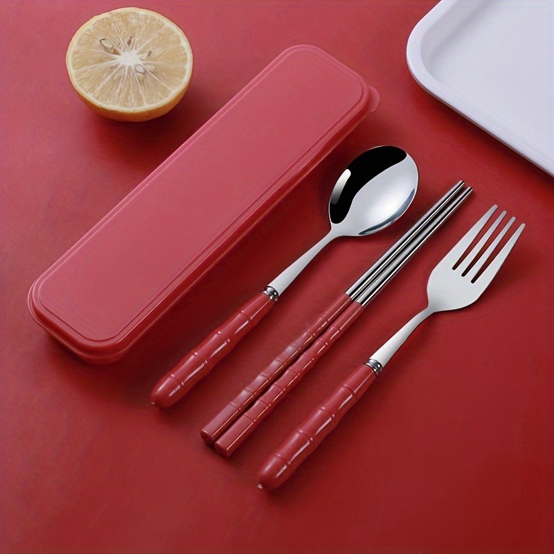 - カトラリーセット ステンレス鋼 箸 フォーク スプーン 3点セット レッド 弁当用 食器セット 収納ケース付 ランチセット かわいい t1003