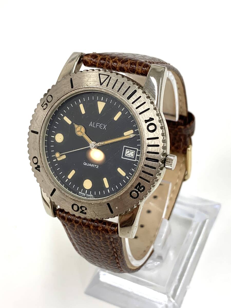 > Z1144◇ 1円~! ALFEX アルフェックス SS QZ クォーツ 黒文字盤 メンズ 腕時計 デイト 稼働 動作確認済