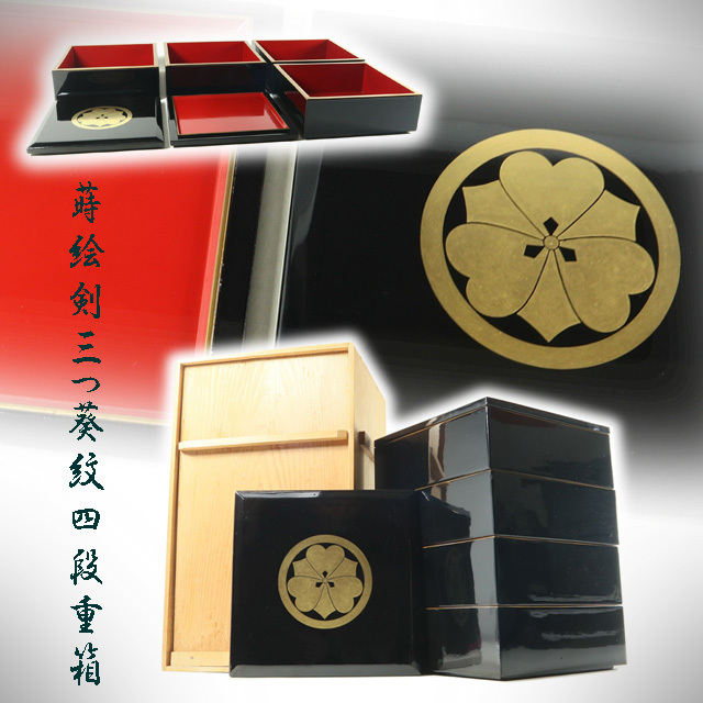 ●c074●【蒔絵剣三つ葵紋四段重箱 鏡面黒地金縁内朱 木製共箱】検お茶会煎茶道具茶懐石●西瓜●