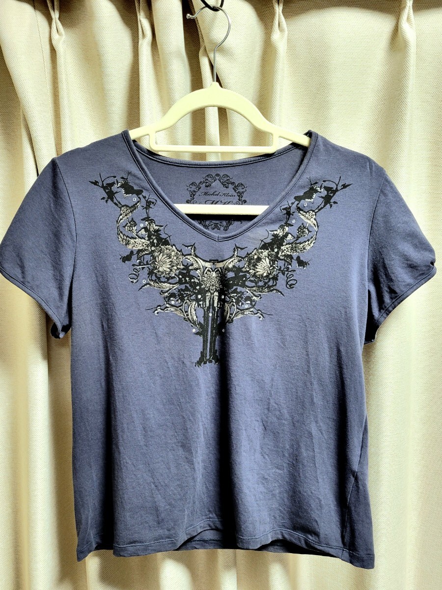 > 状態良好 ミッシェルクラン ラメプリント&ラインストーン付きVネックTシャツ ネイビー パフスリーブ MICHEL KLEIN 大きいサイズ 42 XL