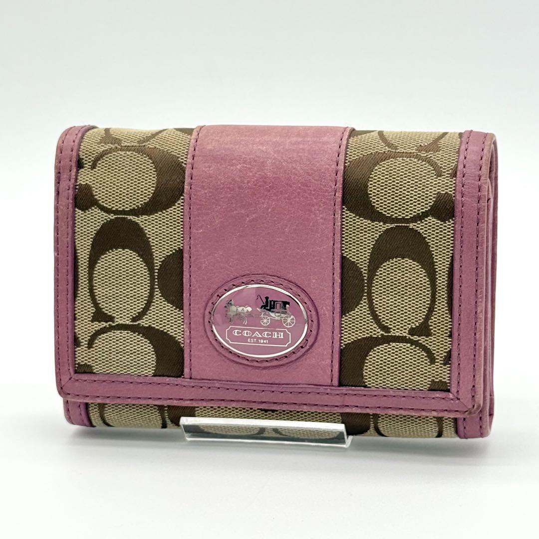 - 【美品】COACH コーチ 二つ折り財布 シグネチャー サークルロゴ ヴィンテージ キャンバス レザー メンズ レディース ピンク BJ810421X