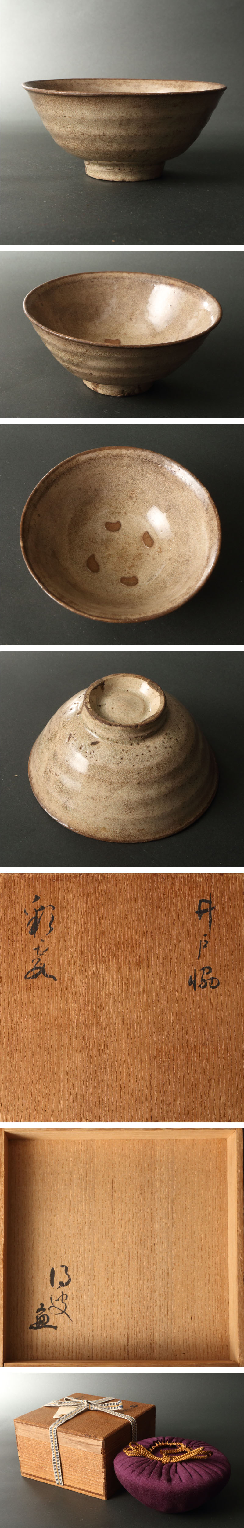 - 委託HK◇時代 井戸脇茶碗 越沢宗見箱書「彩霞」※仕覆添え(茶道具 陶磁器 陶芸 井戸茶碗 高麗茶碗 中国 朝鮮 李朝 古物 骨董 古美術 )