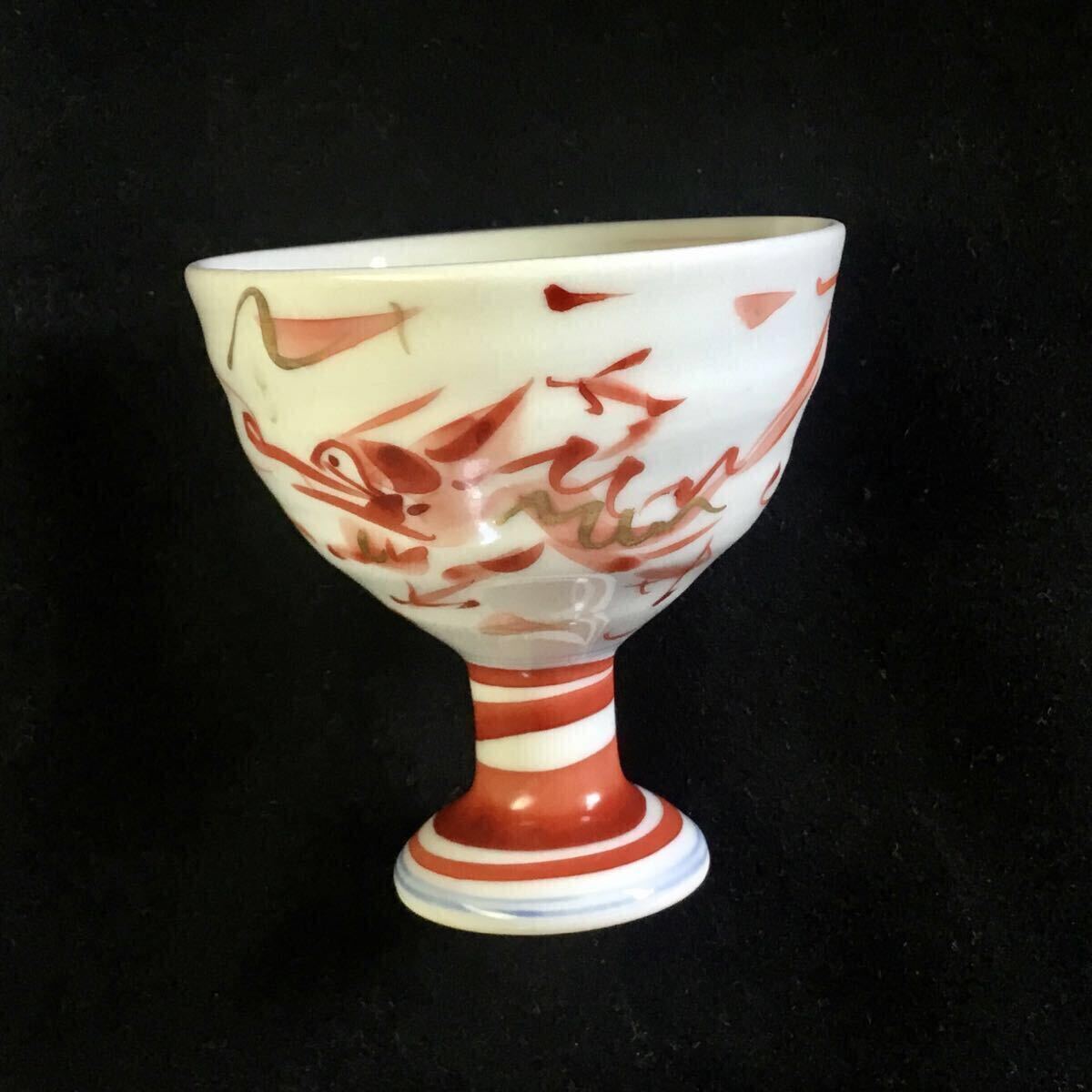 - 九谷焼 赤絵 金彩 龍絵 高脚 盃 ぐい呑 杯 在銘 酒器