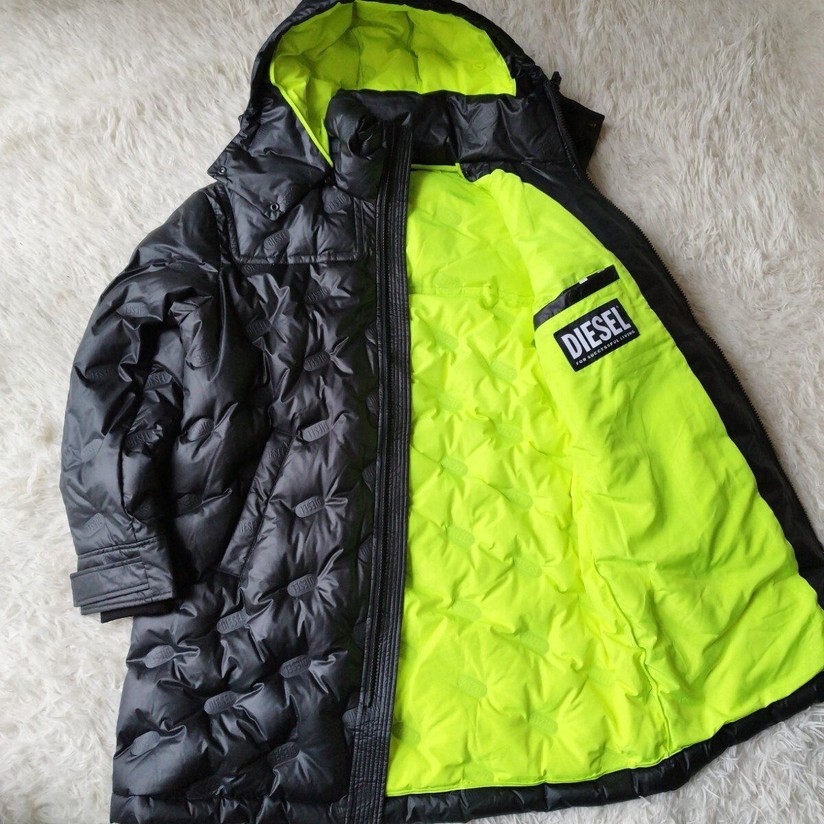 - 【極美品 XL相当】現行タグ DIESEL ディーゼル ダウン コート ロング 総柄ロゴ 型押し ダブルジップ ブラック 裏地光沢イエロー ジャケット