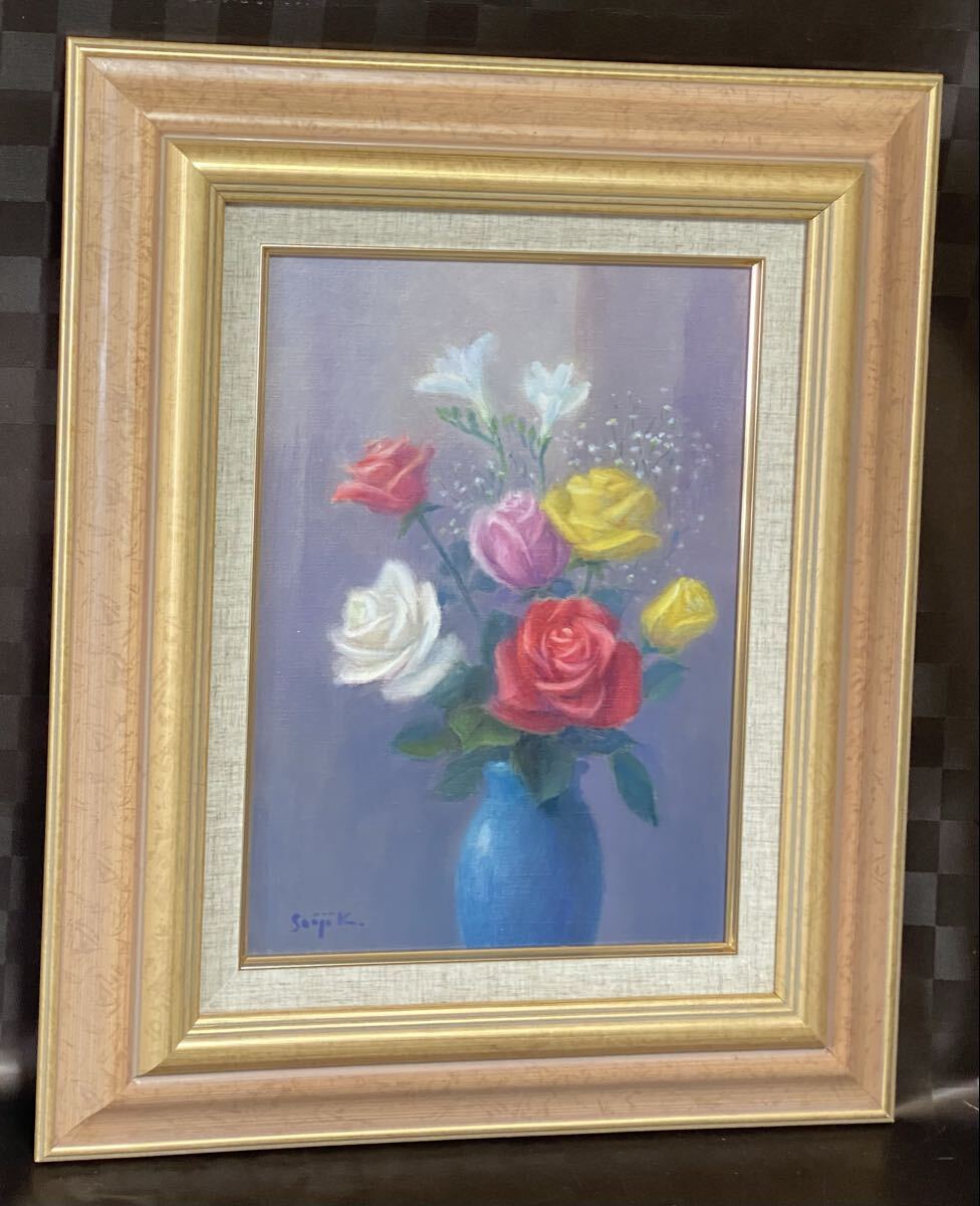 - 真作 油彩画 油絵 作者不明 seiji K 静物画 F4号 薔薇 額縁 額装 インテリア