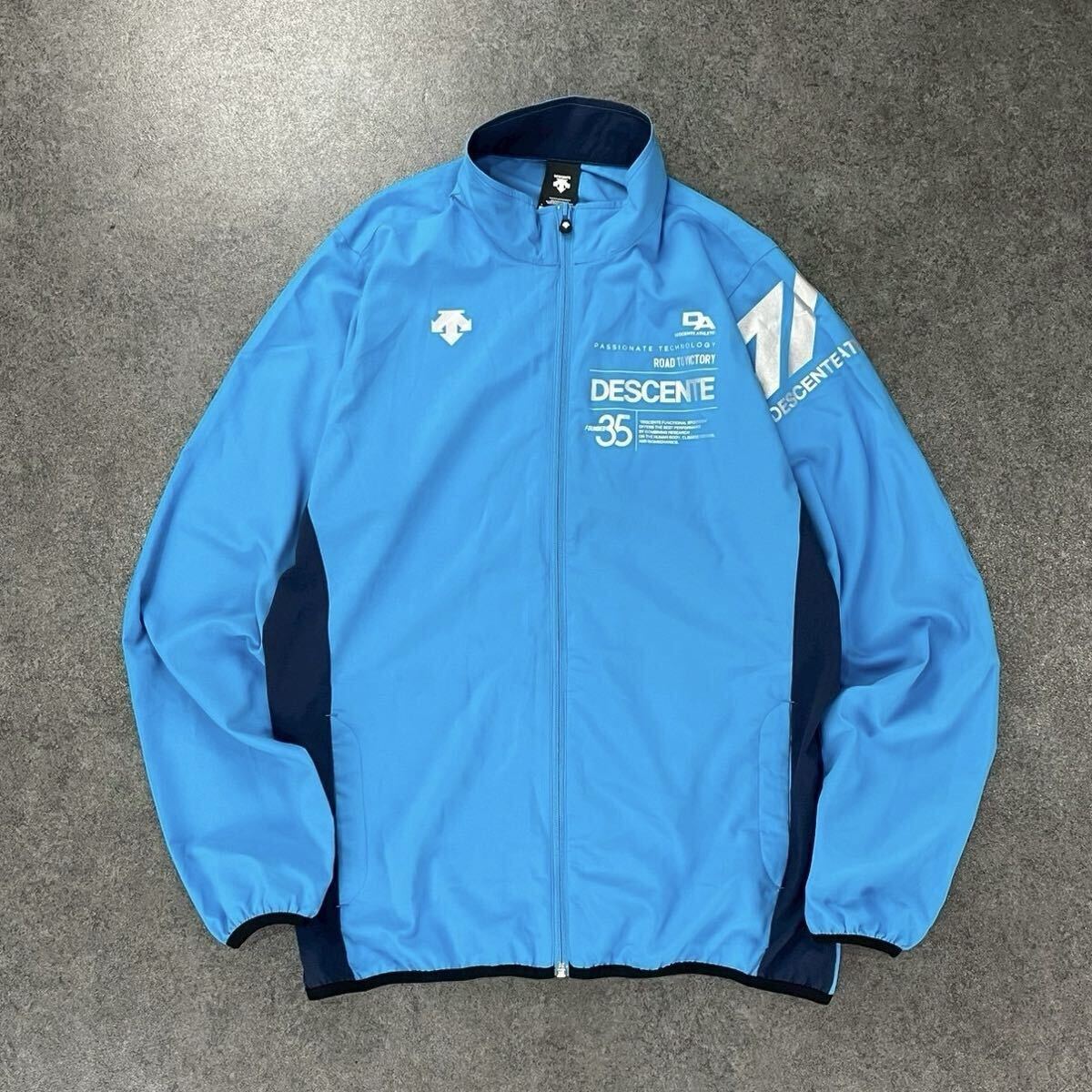 > 美USED DESCENTE Move Sport デサント ムーブスポーツ 薄手 ドライクロストレーニングジャケット 水色 ロゴプリント メンズ L DOR-C8757
