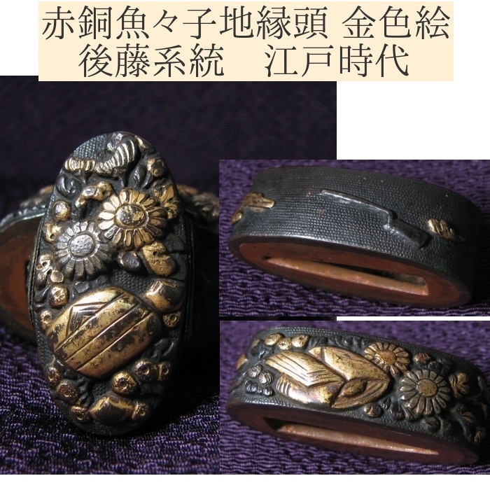 - 時代武具 赤銅魚々子地縁頭 金色絵 後藤系統 桐箱付 江戸時代/24g085