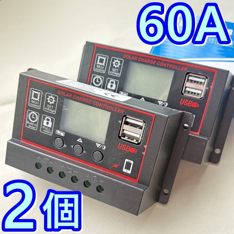 - 2個 60A ソーラー チャージ コントローラー 大容量モデル 12V/24V 自動認識 LCD表示 USB出力付き 太陽光発電用 チャージャー コントロール
