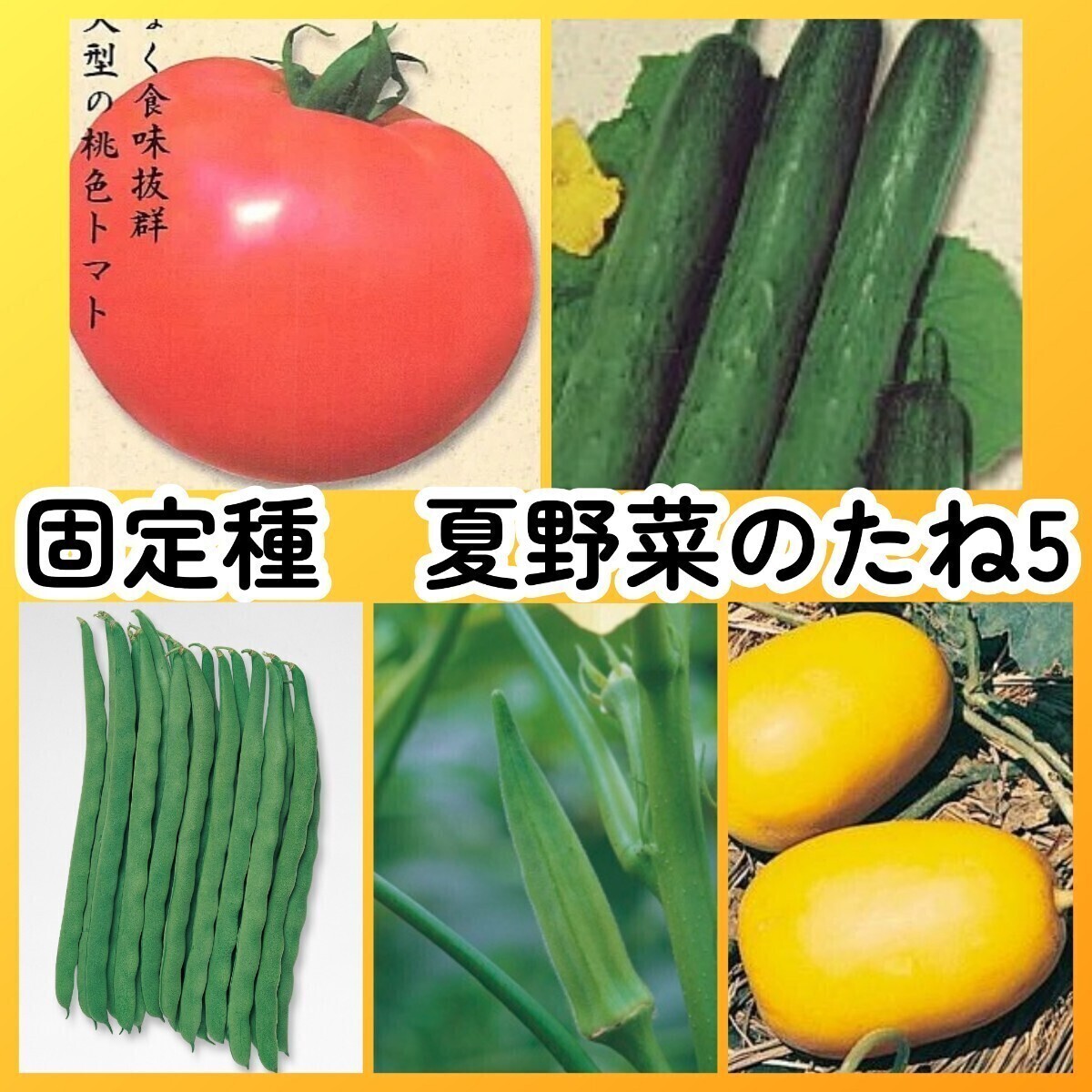 - 匿名配送無料◆固定種夏野菜の種5◆世界一トマト+新ときわ地這いキュウリ+つるありインゲン+東京五角オクラ+マクワウリ奈良一号まくわ