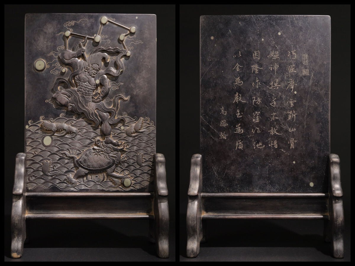 - 「古端石硯 魁星點鬥文房星宿図屏風 高鳳翰銘 清時代」手彫り 文房四宝 書道具 中国古美術 旧蔵出