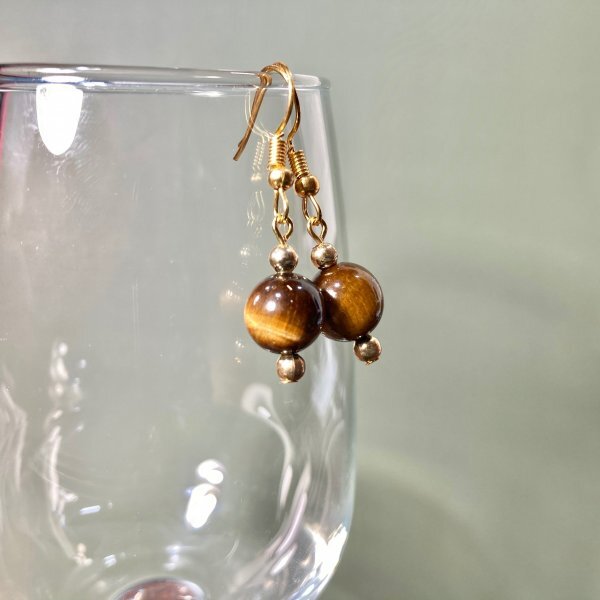 - タイガーアイ ピアス 一粒フックピアス 10mm (ゴールド) イヤリング、樹脂フック変更可 樹脂ピアス シンプル パワーストーン 天然石