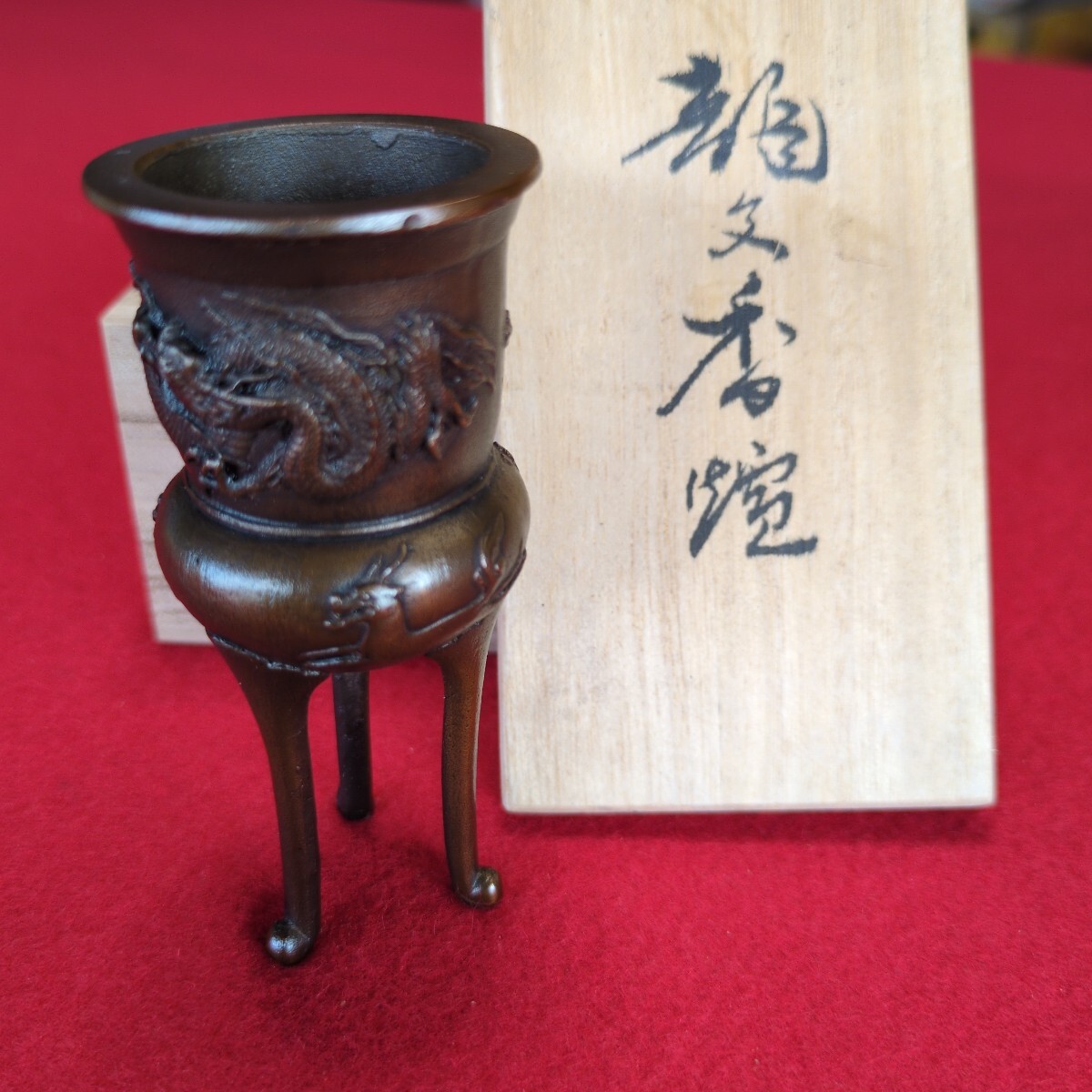 - 2508-74 龍文香炉 真鍮製 置物 時代物 箱付 香爐