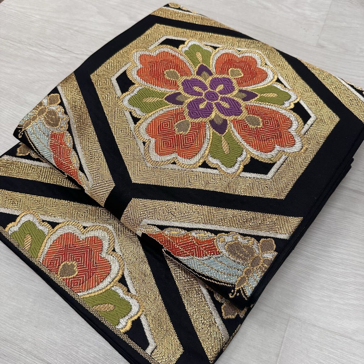 - 袋帯 黒地 亀甲に正倉院模様 豪華金銀糸 正絹 着物 W-4496