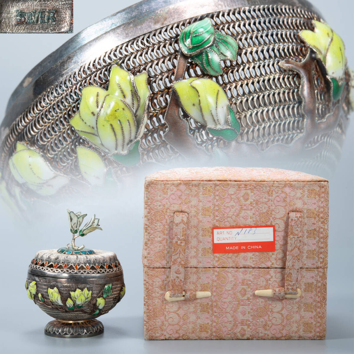 - BR2760-中国美術 銀製 silver 刻印 銀七宝 蓋物・香合・唐物 径7.2cm 高9.5cm 重108.5g