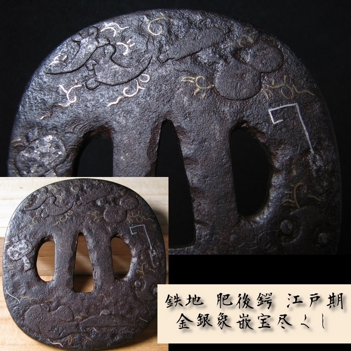 - 時代武具 鉄地大鍔 肥後 金銀象嵌宝尽くしの図 桐箱付 江戸時代/鐔/23f035