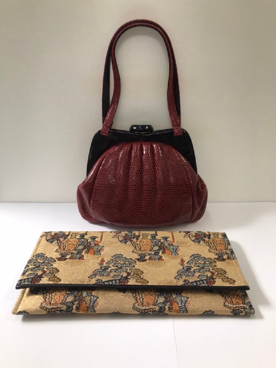 - 1円~【中古】2点セット 正絹 和装 バッグ ハンドバッグ リザード ミラー付き