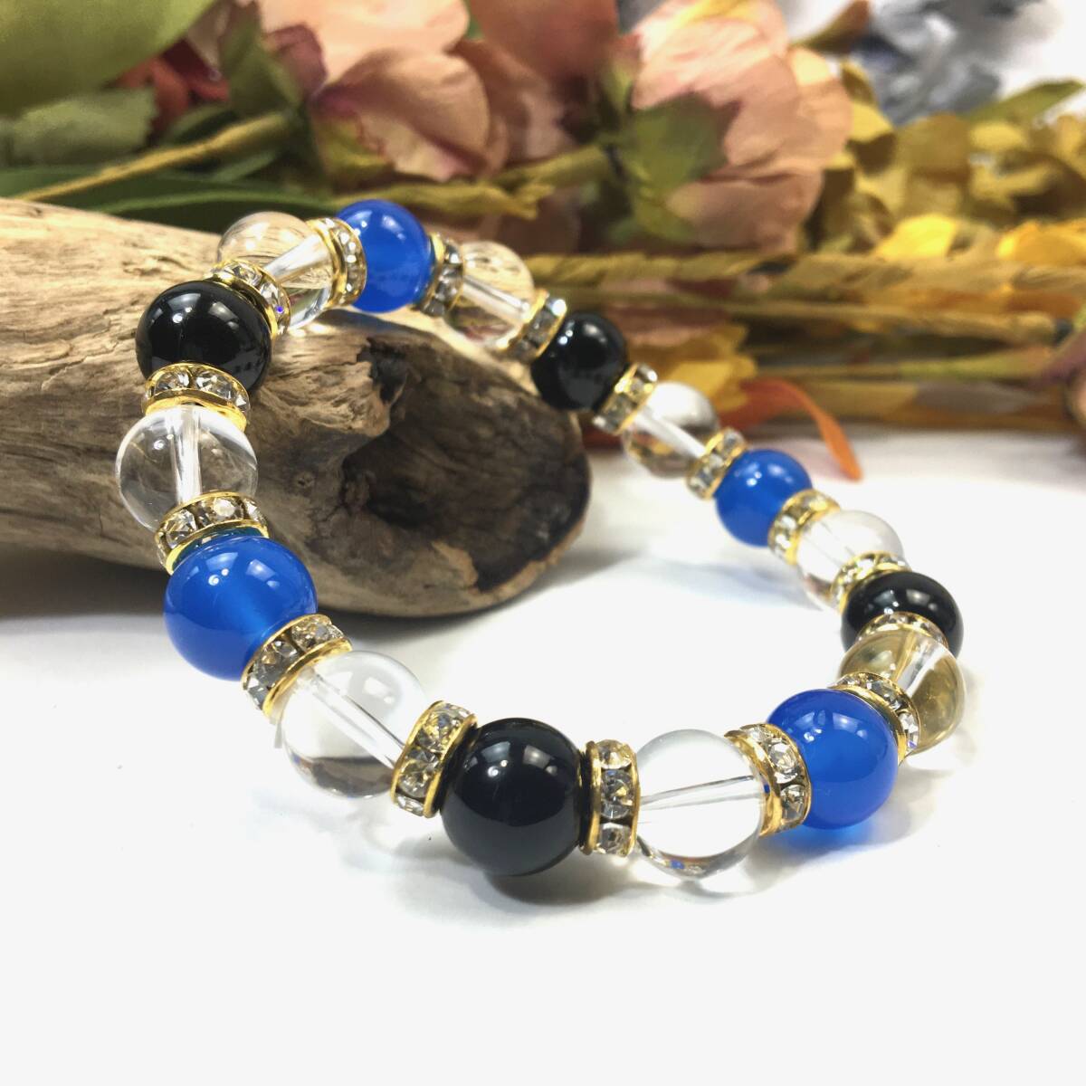 > ブルーメノウ×水晶×オニキス パワーストーン ブレスレット 天然石ブレス (ロンデル: ゴールド) 10mm メンズ・レディース