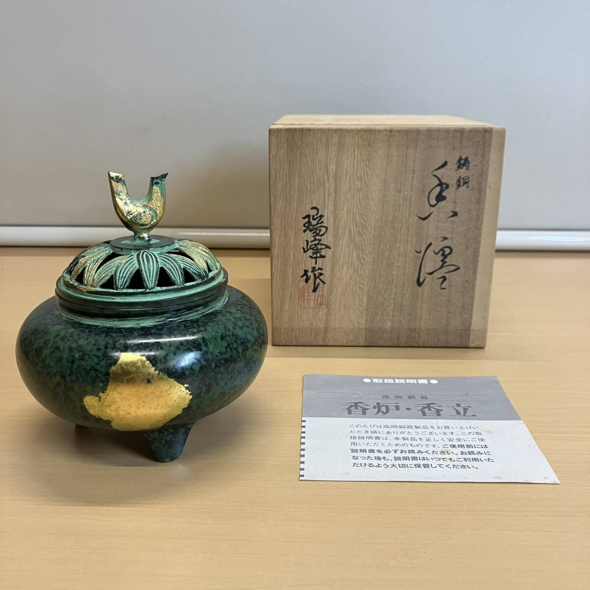 - 高岡銅器 瑞峰作 鋳銅 香炉 珠玉・緑金 箱付未使用品