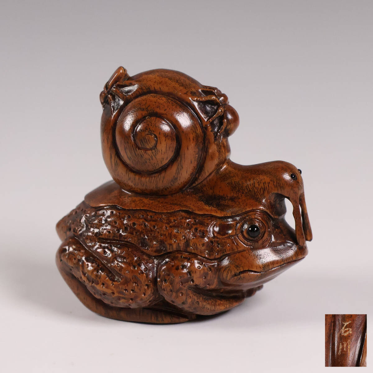 - 木製 提物 根付 石川銘 蛙 蝸牛 蜘蛛 昆虫 彫刻 木彫【MA889】