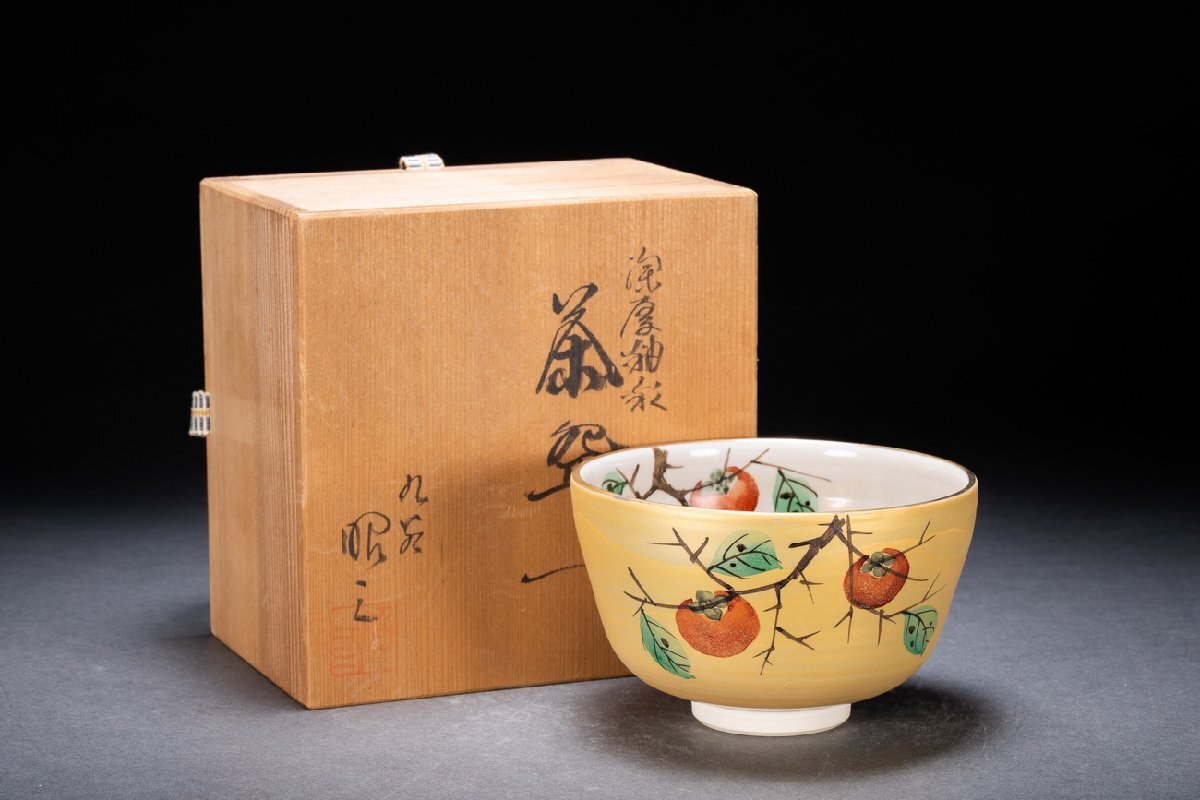 - 【清】九谷焼「華峰」作 色絵柿紋茶碗 茶道具 直入識箱 共布 真作保証 美術品 7L8-108S