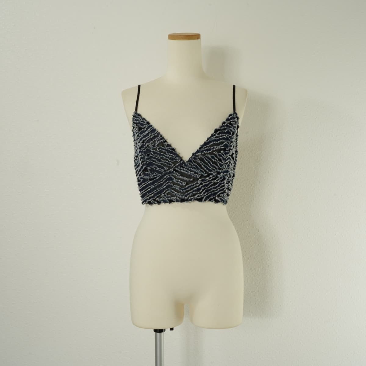 コメント:手作業で施された、オパール加工のデニムビスチェ。日本の熟練した職人技術によって表現できる唯一無二の生地で、オパール加工に洗いをかける事でフリンジ効果を表現され、デニムの隙間生地をあえてシアー素材とすることで程よい抜け感が演出されたアイテムです。軽く柔らかい素材です。ショルダーは調節できません。後ろはリボンで結ぶ仕様です。
