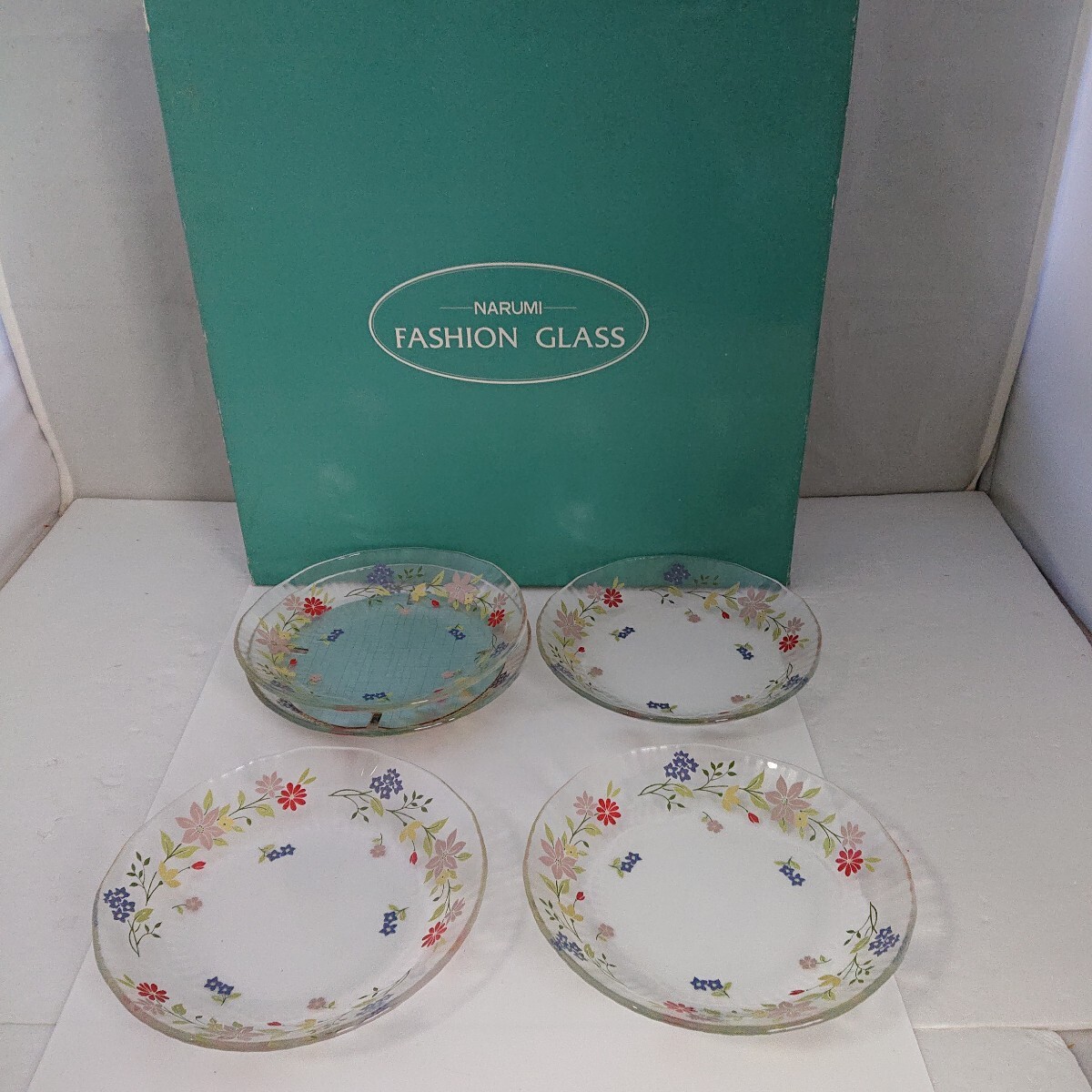 > 【洋食器】NARUMI ファッショングラス N6096−2859 銘々皿揃 5枚セット元箱入り 花柄 ガラス レトロ 当時物 現状品 ぷらみ1001 06