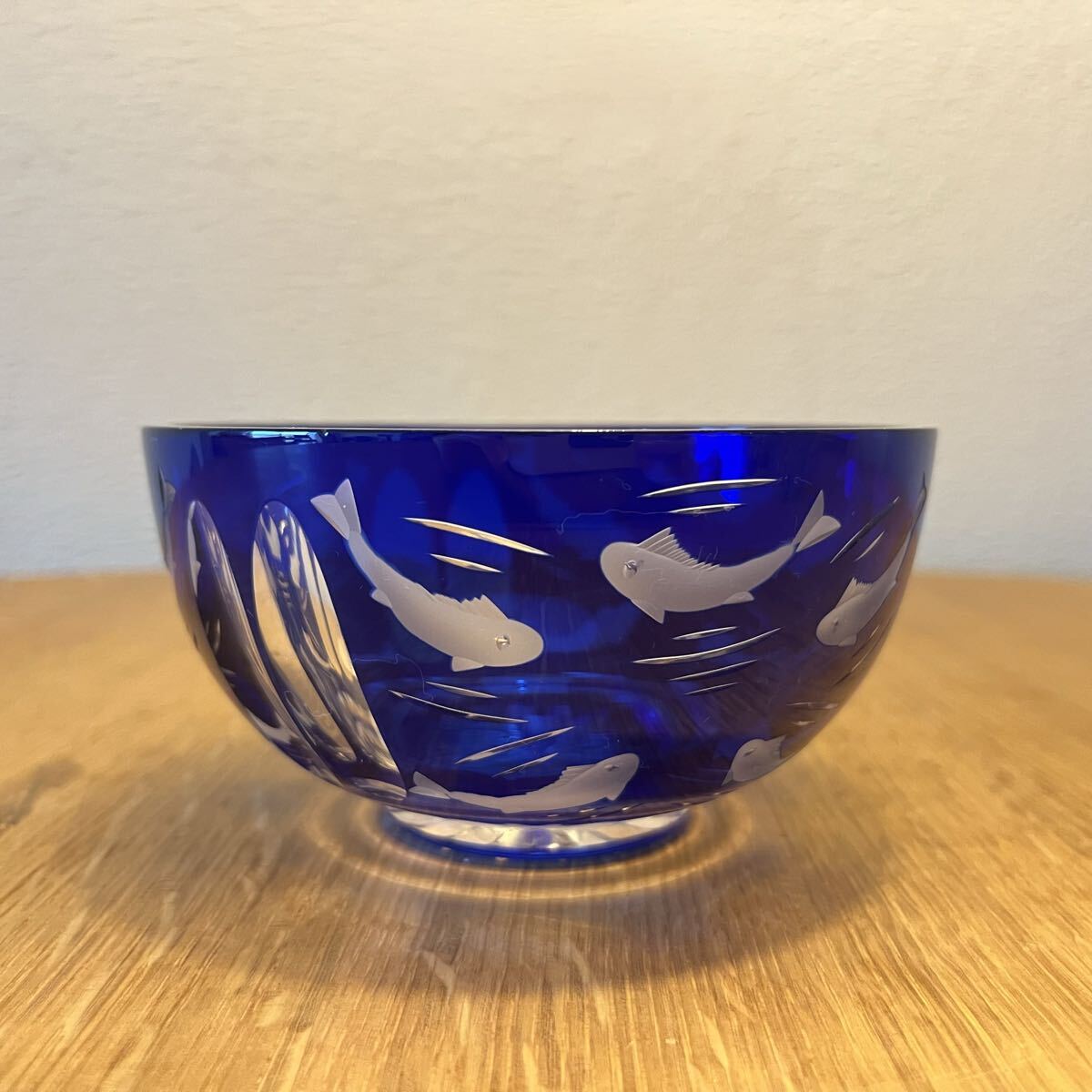 - 【美品】江戸切子 切子 冷茶碗 丸小鉢 食器 青 ブルー 魚 可愛 ガラス 工芸 切子グラス 硝子 コバルトブルー