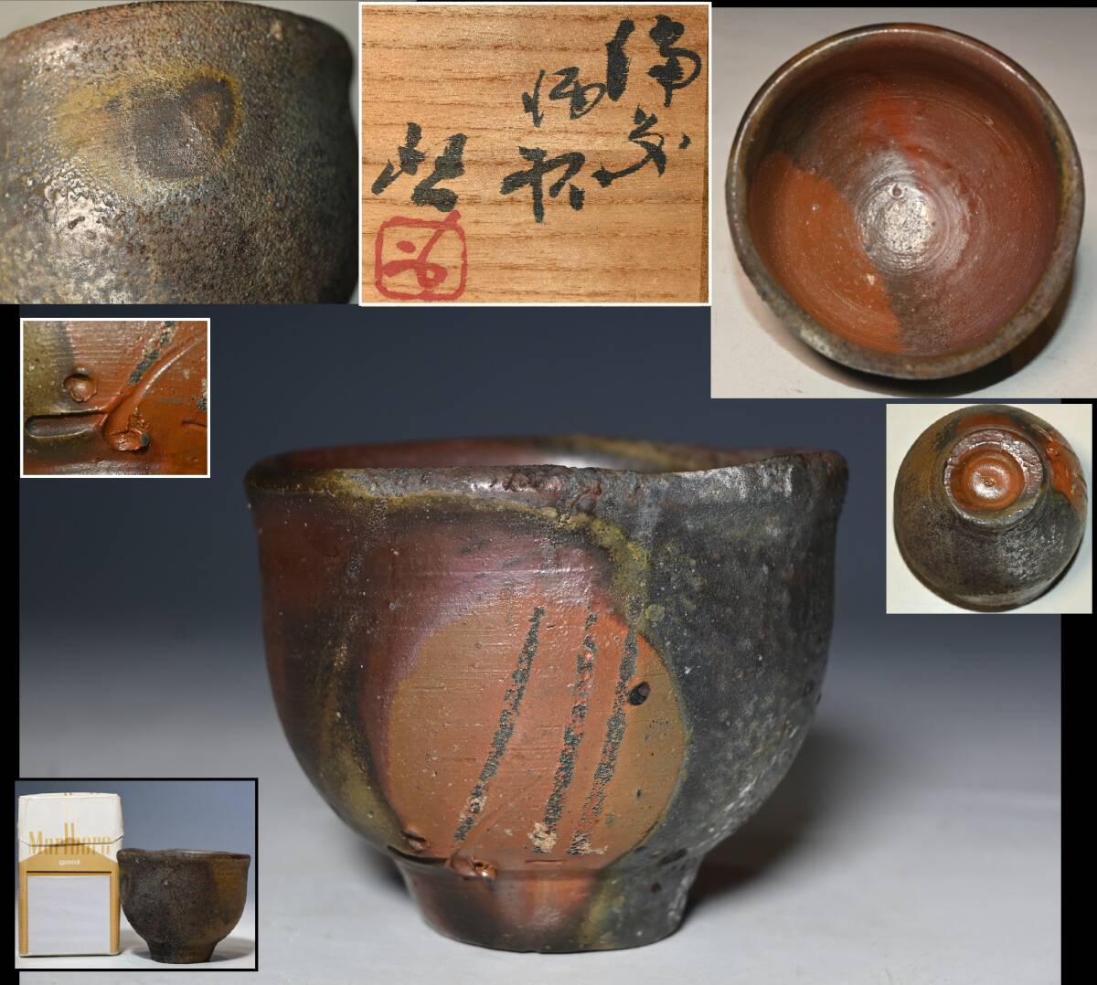 - 真贋保証■人間国宝 藤原啓 作■ 備前 酒杯 窯変 共箱・共布 酒器 酒盃 ぐい呑 酒呑 検:日本酒 酒肴