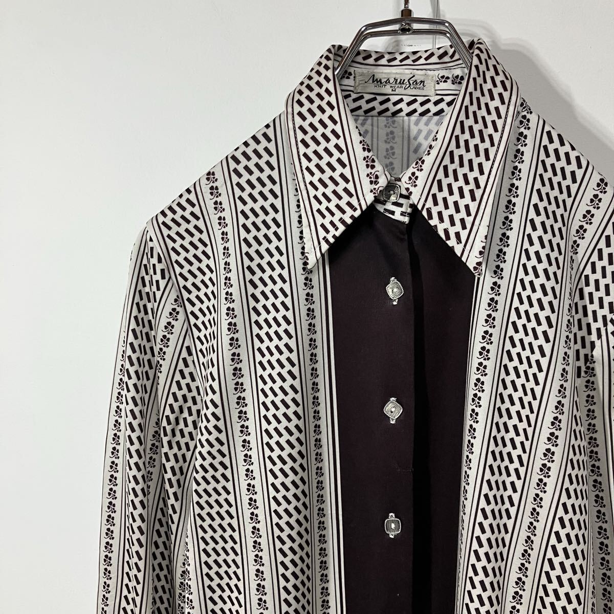> 古着 ヴィンテージ パターン柄 ストライプ レトロ ボタン スクエアカット ニット 長袖 シャツ ホワイト ブラウン M