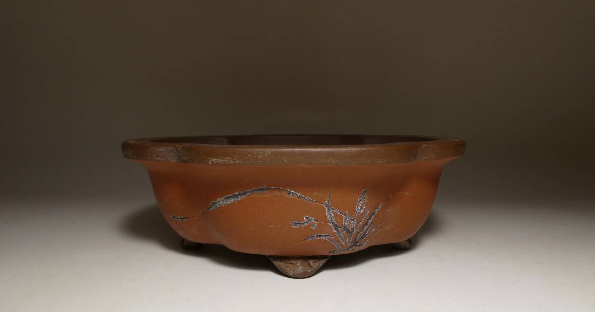 - ■中国鉢[荊渓製陶]朱泥釘彫外縁雲脚木瓜鉢 13.8×11.4×4.3cm