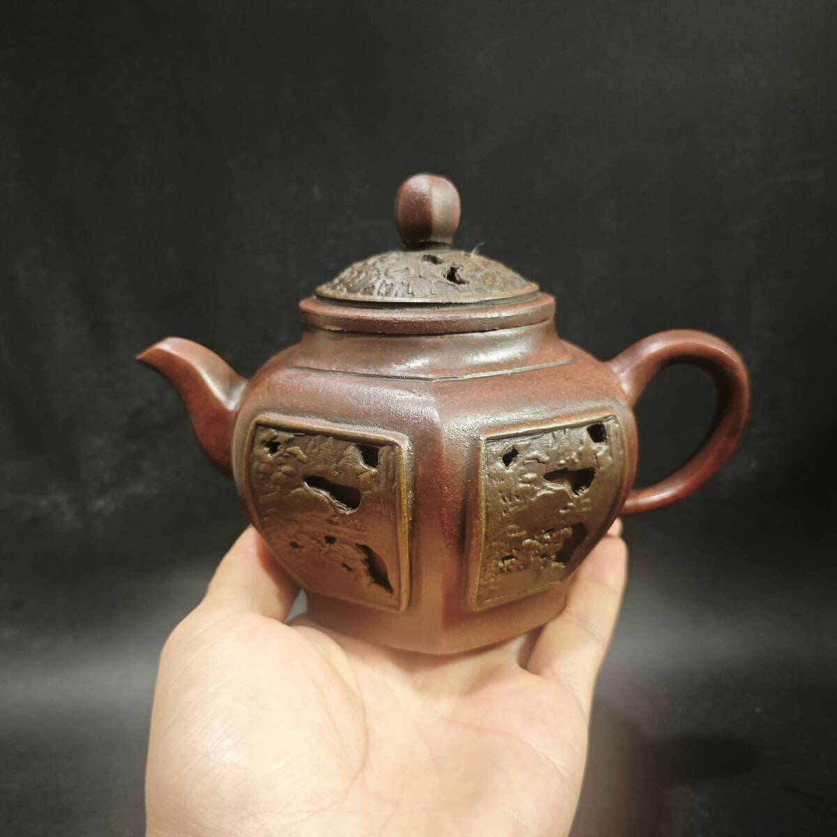 - 【超珍館蔵】紫砂壺 六方鏤空壺 顧景舟款 古紅料 茶具 茶道品 置物 賞物 古賞物 古董品 古美術品 時代物 旧家蔵出 稀少珍蔵品