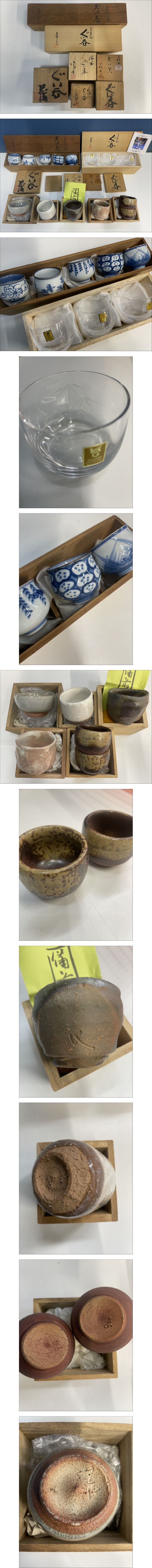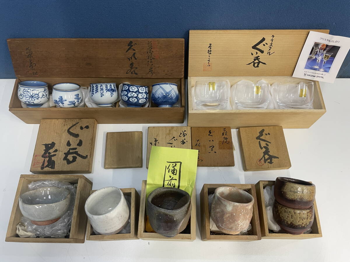 - 10-B7/1-80 ぐい呑み 酒器 お猪口 冷酒 まとめて 7点セット 木箱付き カガミクリスタル 有田焼 備前焼 萩焼 他