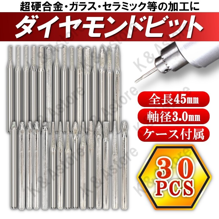 > ダイヤモンドビット 軸径3.0㎜ 30本 収納ケース付属 研削 超硬バー ミニルーター用 リューター ハンドグラインダー DIY 工具 彫刻ツール