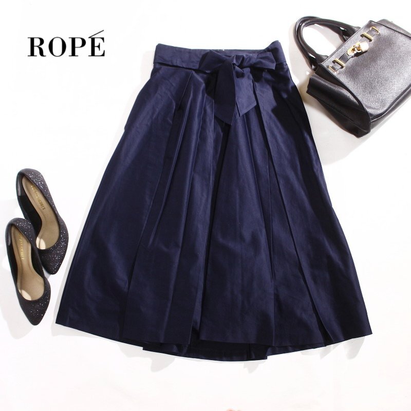 > 美品 ROPE’ ロペ 通年 合物 ベルト付き フレアスカート 7号 36 ネイビー 紺 ミセス オフィス ミディ ミモレ丈 通勤 上品 艶 セレモニー