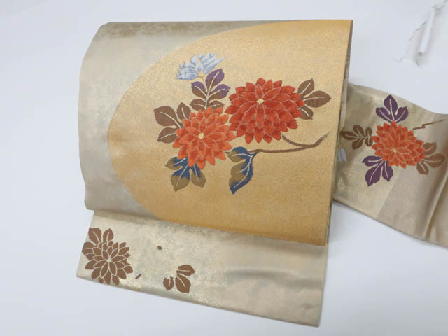 - 《京都一輝堂》リサイクル着物 九寸名古屋帯 六通 金糸 花 正絹 25b08-1517