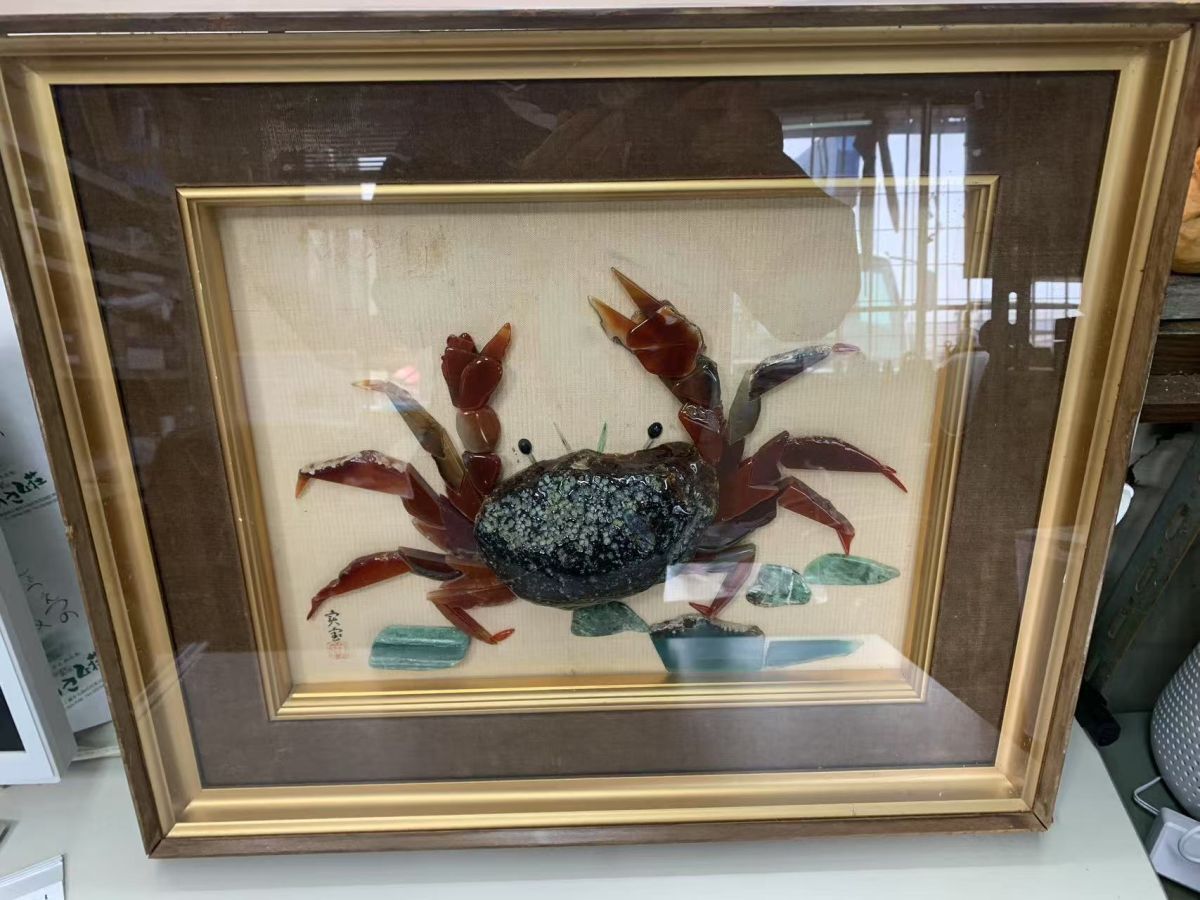 - 3F1029→蟹 かに 鮮やかな蟹 縁起物 天然宝石蟹板画木製枠 壁掛け宝石芸術品 貴石画 宝石画 ストーンアート インテリア 中古
