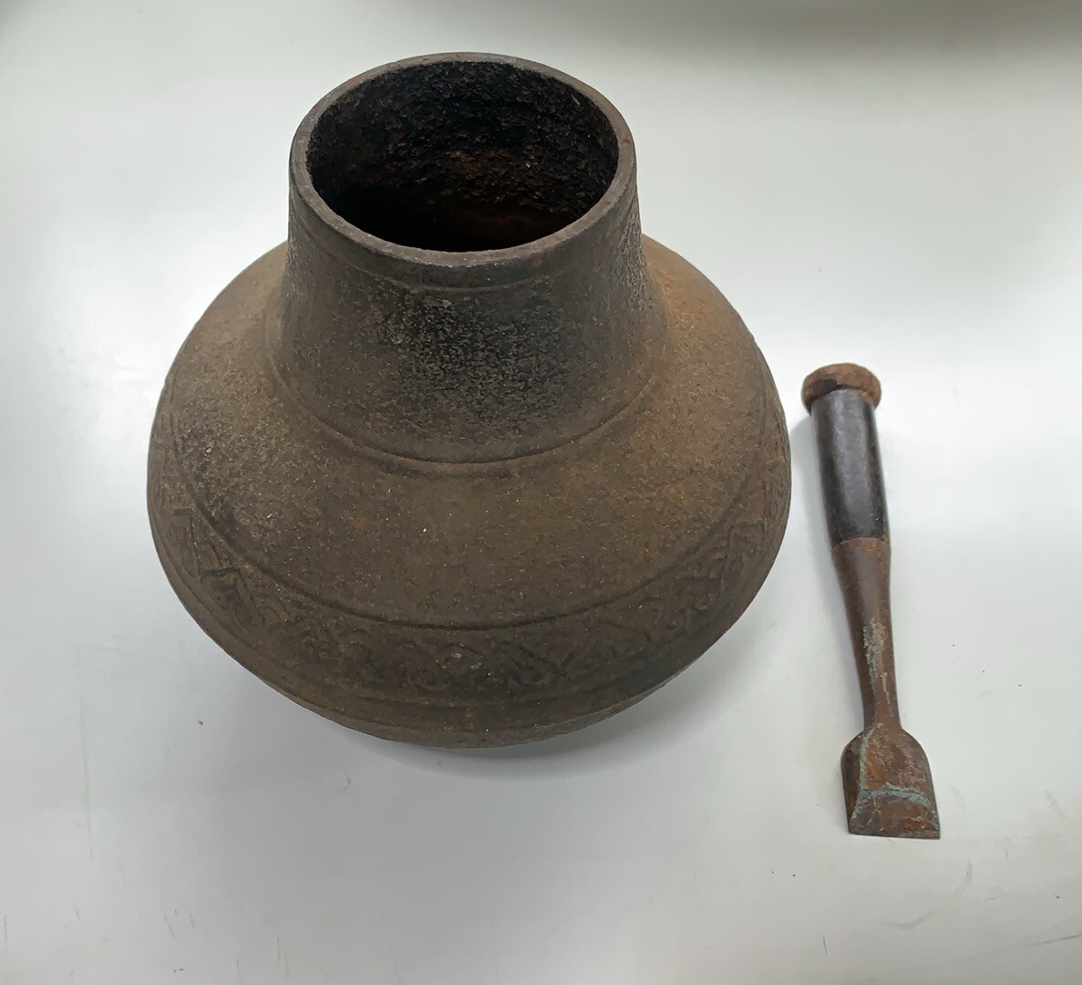 - B2128→鉄 壺 鋳物 鉄器 鉄壺 勺立て 鉄瓶 種壺型 置物 花器 花瓶 銘あり アンティーク 詳細不明 旧家